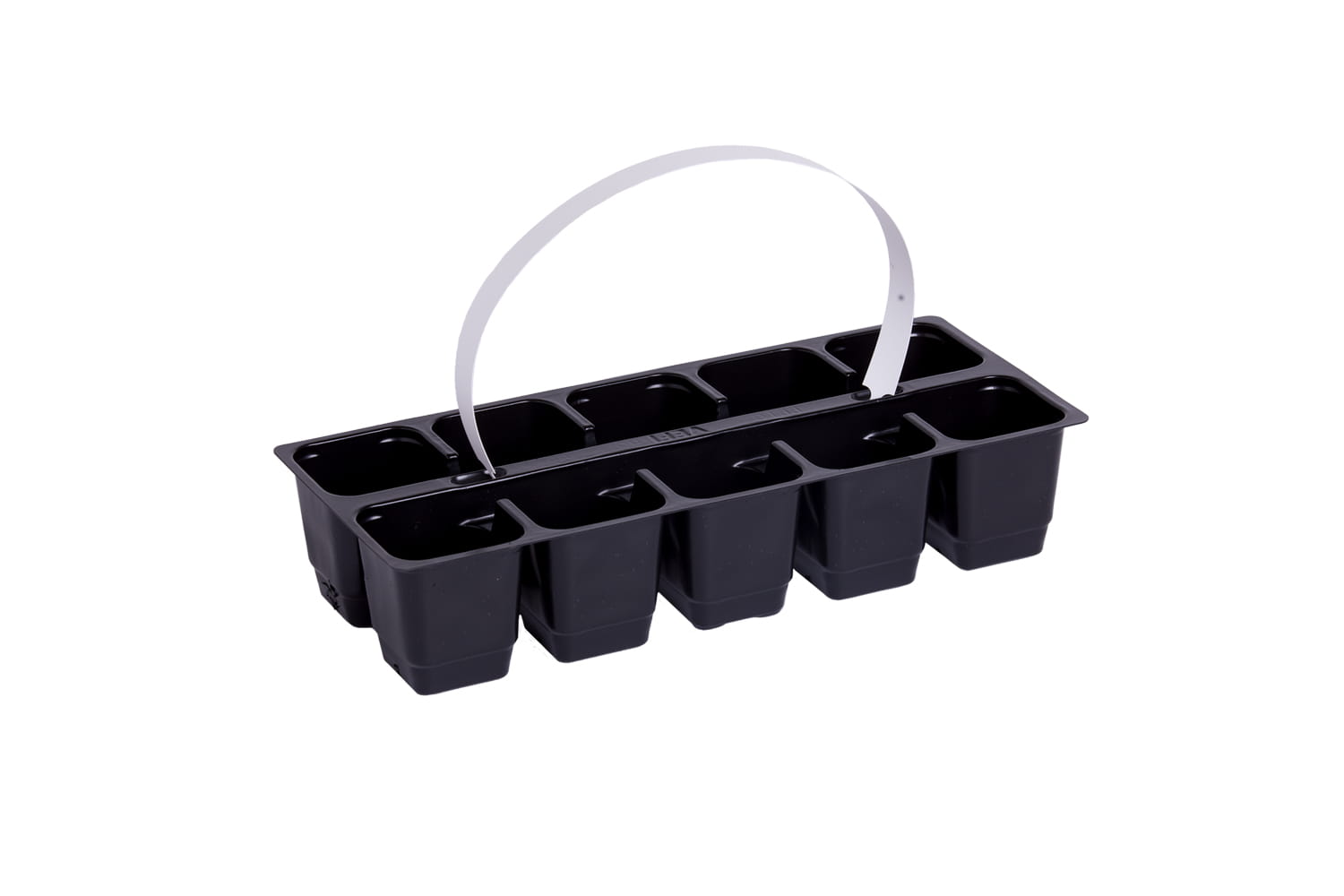 Pojemniki z tworzywa sztucznego przeznaczone do produkcji rozsady i transportu sadzonek. Czarne doniczki z uchwytem doskonale nadają się do uprawy małych roślin, ukorzeniania sadzonek oraz siewu ziół i innych nasion.