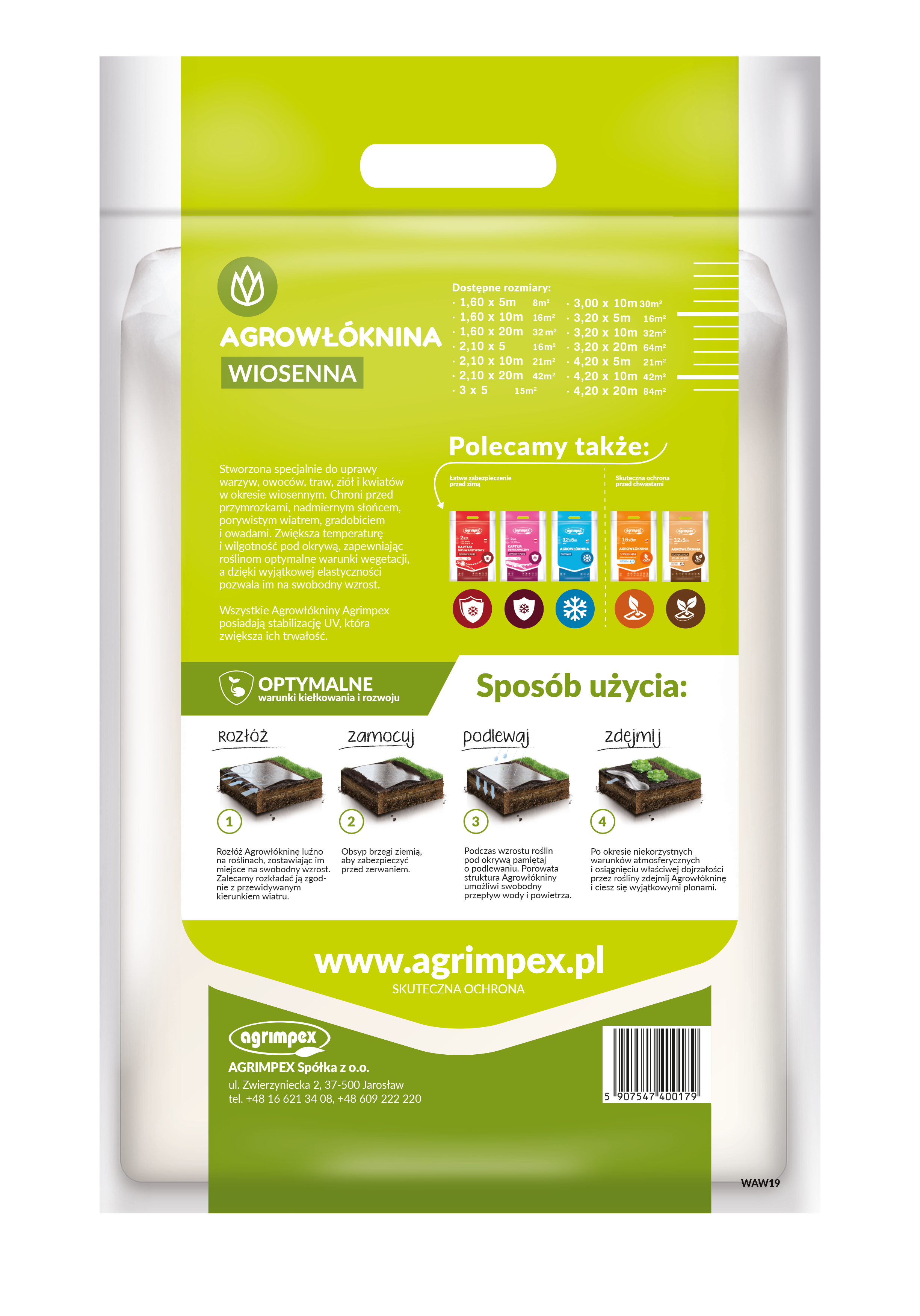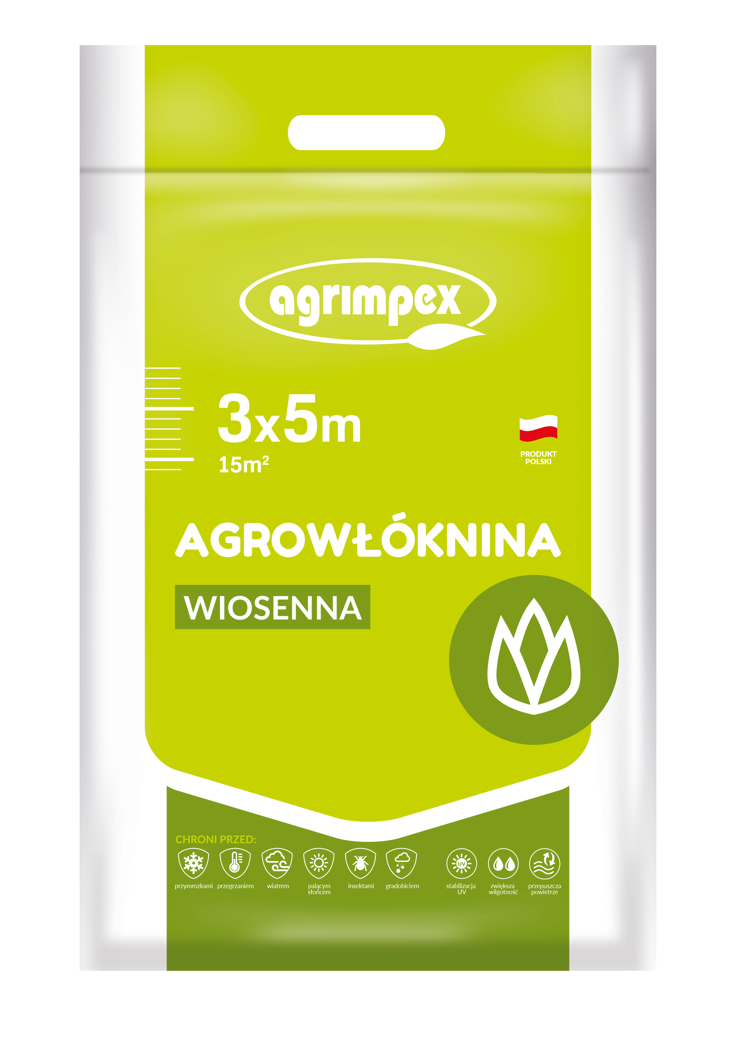 Stworzona specjalnie do uprawy warzyw, owoców, traw, ziół i kwiatów w okresie wiosennym. Chroni przed przymrozkami, nadmiernym słońcem, porywistym wiatrem, gradobiciem i owadami. Zwiększa temperaturę i wilgotność pod okrywą, zapewniając roślinom optymalne warunki wegetacji, a dzięki wyjątkowej elastyczności pozwala im na swobodny wzrost. Wszystkie Agrowłókniny Agrimpex posiadają stabilizację UV, która zwiększa ich trwałość.