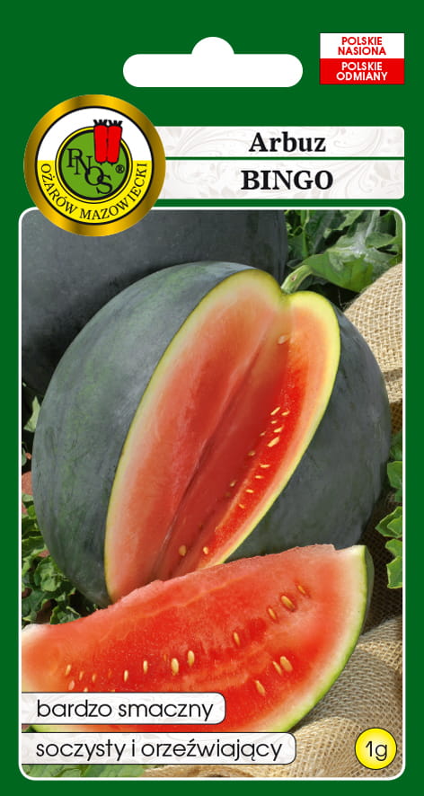 Arbuz Bingo to wyselekcjonowana odmiana idealnie sprawdzająca się w klimacie umiarkowanym. Odmiana ta jest bardzo plenna. Owoce arbuza Bingo są duże, owalne, osiągają masę 8-12 kg. Miąższ słodki, soczysty i bardzo aromatyczny. Skórka odmiany Bingo ma ciemnozielony kolor z delikatnymi, jaśniejszymi smugami. Roślina jest wybitnie ciepłolubna. Wymaga silnego nawożenia.