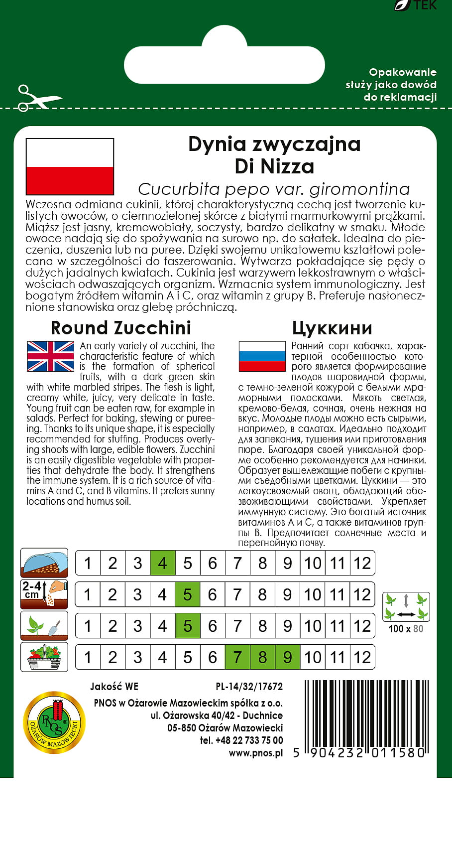 Wczesna odmiana, której charakterystyczną cechą jest tworzenie kulistych owoców o ciemnozielonej skórce z białymi marmurkowymi prążkami. Miąższ jest jasny, kremowobiały, soczysty, bardzo delikatny w smaku. Młode owoce nadają się do spożywania na surowo np. do sałatek. Idealna do pieczenia, duszenia lub na puree. Dzięki swojemu unikatowemu kształtowi polecana w szczególności do faszerowania. Wytwarza pokładające się pędy o dużych, jadalnych kwiatach. Cukinia jest warzywem lekkostrawnym, o właściwościach odkwaszających organizm. Wzmacnia system immunologiczny. Jest bogatym źródłem witamy A i C oraz witam z grupy B. Preferuje nasłonecznione stanowiska i glebę próchniczą.