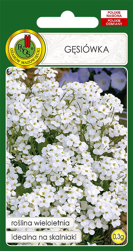 Gęsiówka Biała to wieloletnia bylina o białych, drobnych i bardzo licznych kwiatach osadzonych w zwartych gronach. Doskonała na ogródki skalne, murki, skarpy. Gęsiówka doskonale rośnie na każdej przepuszczalnej glebie. Kwitnie w maju w drugim roku od wysiania. Wysiewamy kwiecień-maj na rozsadniku, natomiast na miejsce stałe przesadzamy we wrześniu.