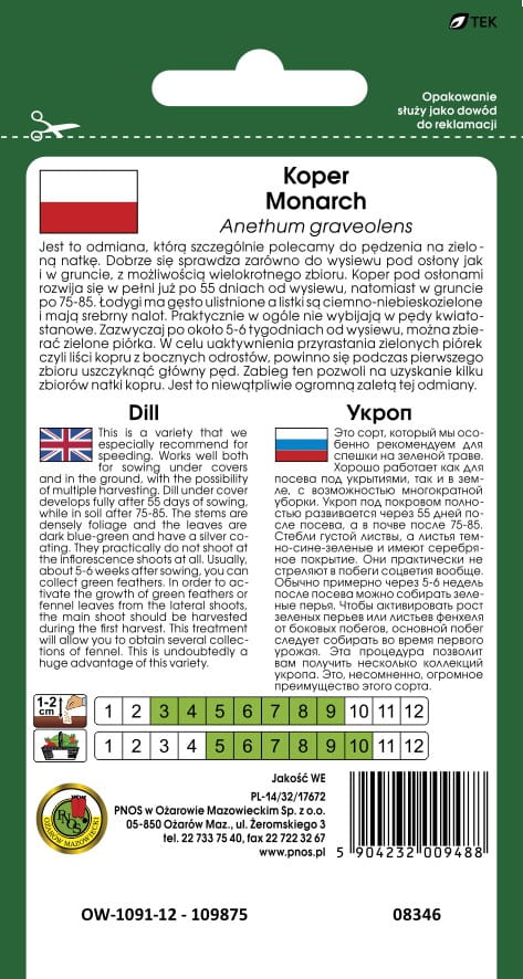 Późna odmiana kopru. Jest to odmiana, którą szczególnie polecamy do pędzenia na zieloną natkę. Dobrze się sprawdza zarówno do wysiewu pod osłony jak i w gruncie, z możliwością wielokrotnego zbioru. Koper pod osłonami rozwija się w pełni już po 55 dniach od wysiewu, natomiast w gruncie po 75-85. Łodygi ma gęsto ulistnione listki są ciemno-niebieskozielone i mają srebrny nalot. Praktycznie w ogóle nie wybijają w pędy kwiatostanowe. Zazwyczaj po około 5-6 tygodniach od wysiewu, można zbierać zielone piórka. W celu uaktywnienia przyrastania zielonych piórek czyli liści kopru z bocznych odrostów, powinno się podczas pierwszego zbioru uszczyknąć główny pęd. Zabieg ten pozwoli na uzyskanie kilku zbiorów natki kopru. Jest to niewątpliwie ogromną zaletą tej odmiany.