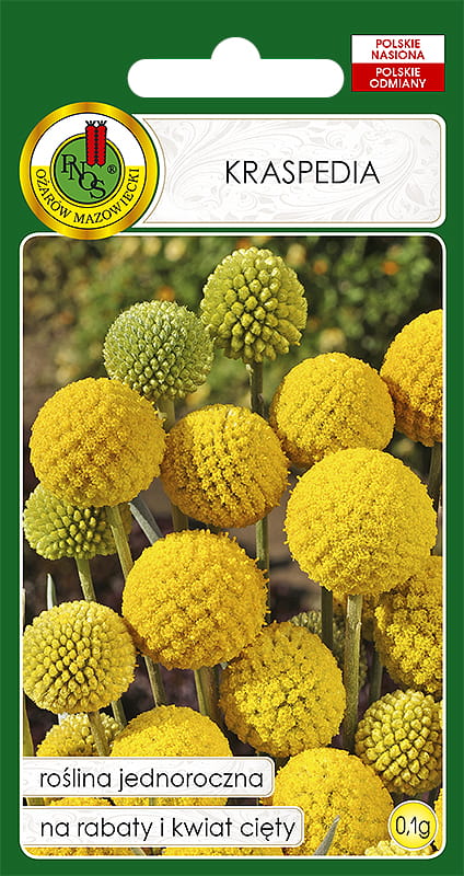 Kraspedia żółta należy do roślin astrowatych. Jej wysokość wynosi 60-70cm. Na szczytach sztywnych, bezlistnych pędów znajdują się żółte koszyczki kulistych kwiatów. Przeciętna średnica kwiatostanu to 2-3cm.