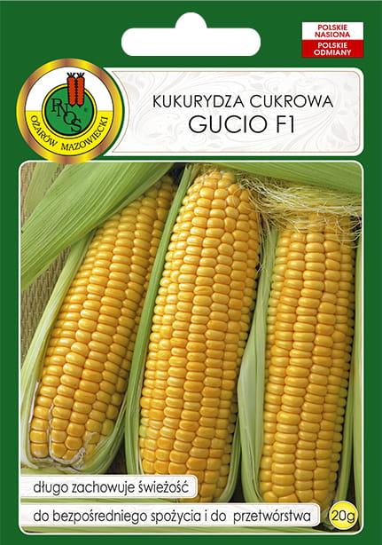 Kukurydza cukrowa Gucio F1 to wczesna odmiana mieszańcowa, charakteryzująca się niezwykle słodkim smakiem. Okres wegetacji tej kukurydzy trwa około 110–120 dni. Roślina osiąga do 170cm wzrostu, tworzy cylindryczne kolby o długości do 25cm i średnicy około 5cm. Liście na kolbach są na tyle zwięzłe, że solidnie je otulają, wręcz zamykają. Ziarna przybierają ładny, regularny kształt i ubarwiają się na kolor żółty z odcieniem pomarańczowym. Skórka ziaren jest niezwykle delikatna, dzięki czemu kolby tej odmiany są wysoko cenione przez konsumentów.