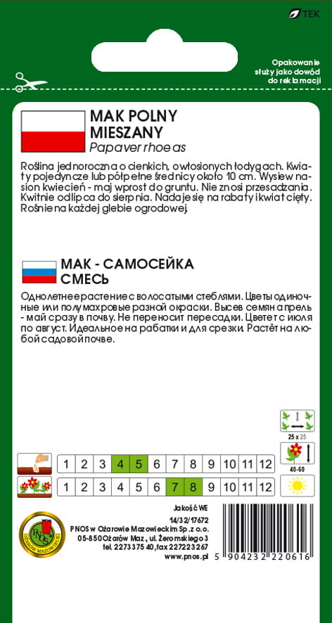 Nasiona wysiewamy wprost do gruntu. Mak nie jest wymagający, nie potrzebuje żadnej pielęgnacji ani nawożenia- rośnie na każdej glebie ogrodowej.