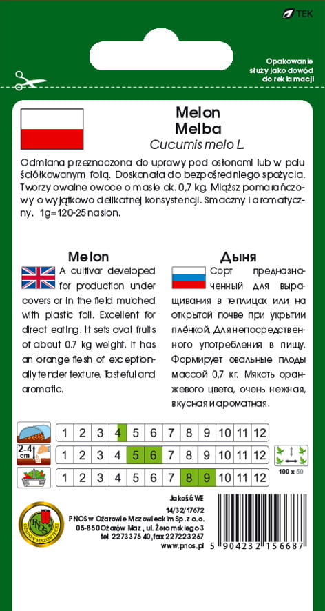 Wczesna odmiana melona. Do uprawy pod osłonami lub w polu ściółkowanym folią. Rośliny o średniej sile wzrostu, jednopienne. Owoce owalne lub odwrotnie jajowate o kremowej skórce pokrytej niewielką siateczką i masie 0,5-0,7 kg. Miąższ pomarańczowy, gruby o masłowej konsystencji, aromatyczny, smaczny. Odmiana doskonała do bezpośredniego spożycia. Plon owoców 2-3 kg/m2 pod osłonami i 15-20 t/ha przy ściółkowaniu.
