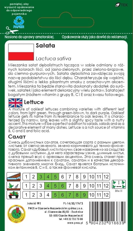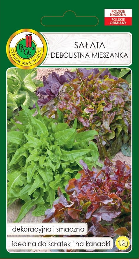 Mieszanka starannie dobranych odmian sałat dębolistnych o zróżnicowanej barwie liści – od jasnozielonej, przez zielonobrązową, aż po intensywnie purpurową. Sałata dębolistna zawdzięcza swoją nazwę charakterystycznemu kształtowi liści, przypominających liście dębu.