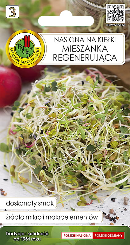 Mieszanka regenerująca to starannie dobrana kompozycja nasion rzodkiewki, lucerny, rzeżuchy oraz kapusty czerwonej, stworzona z myślą o wspieraniu naturalnej odporności organizmu. Kiełki uzyskane z tej mieszanki są prawdziwą bombą witaminową – bogate w witaminy, mikro- i makroelementy oraz przeciwutleniacze.