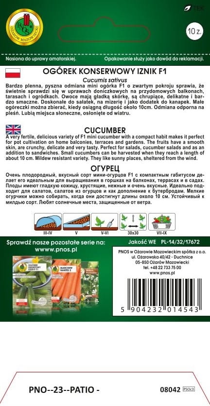 Bardzo plenna, smaczna odmiana mini ogórka F1 o zwartym pokroju, która świetnie sprawdzi się w uprawach doniczkowych na przydomowych balkonach, trasach i ogródkach. Owoce mają gładką skórkę, są chrupiące, delikatne i bardzo smaczne. Doskonałe do sałatek, na mizerię i jako dodatek do kanapek. Małe ogóreczki można zbierać, kiedy osiągną długość około 10cm. Odmiana odporna na pleśń. Lubią miejsca słoneczne i osłonięte od wiatru.