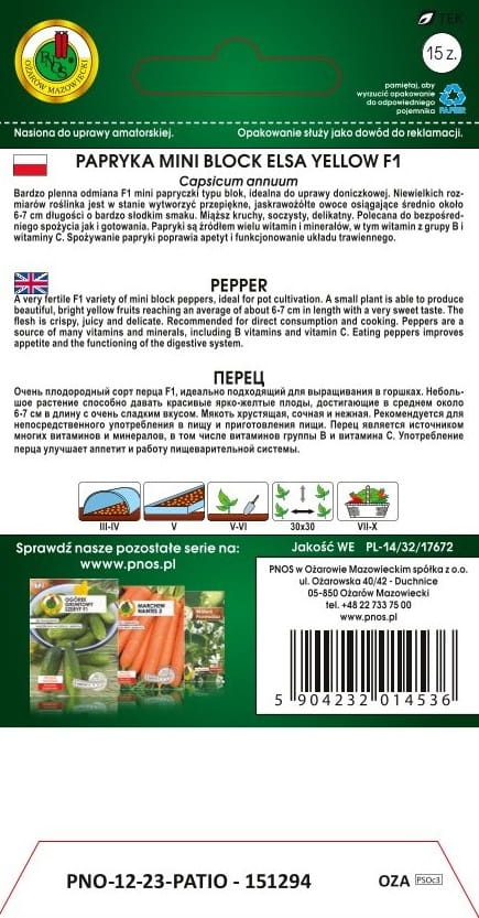 Bardzo plenna odmiana F1 mini papryczki typu blok. Idealna do uprawy doniczkowej. Niewielkich rozmiarów roślinka jest w stanie wytworzyć przepiękne, jaskrawożółte owoce osiągające średnio około 6-7cm długości o bardzo słodkim smaku. Miąższ kruchy, soczysty, delikatny. Polecana do bezpośredniego spożycia jak i gotowania. Papryki są źródłem wielu witamin i minerałów. Spożywanie papryki poprawia apetyt.