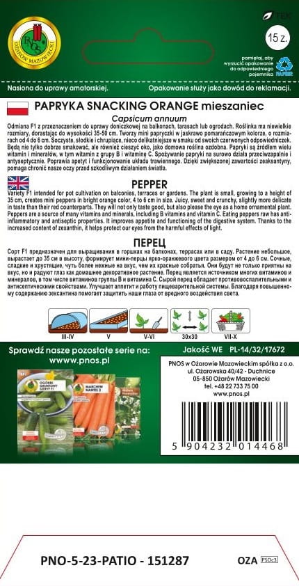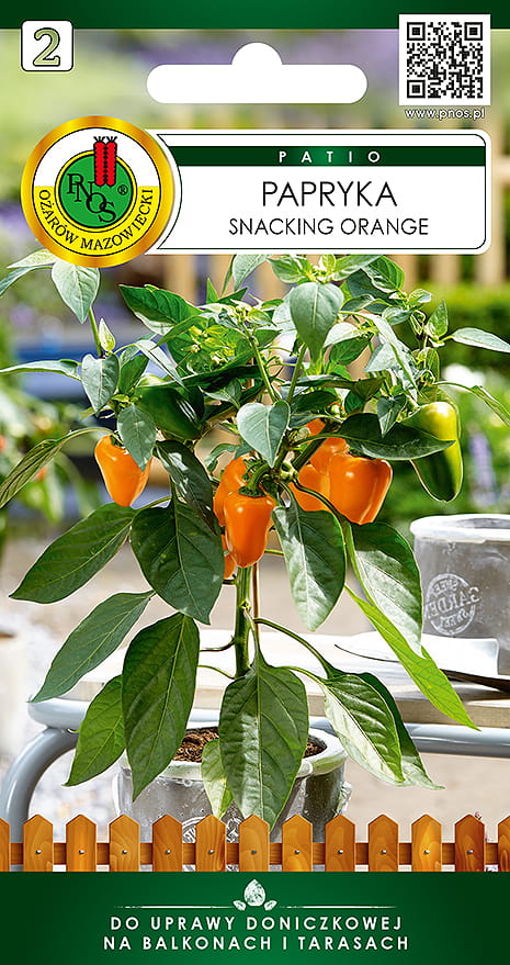 Odmiana F1, idealna do uprawy doniczkowej na balkonach, tarasach lub ogrodach. Roślinka ma niewielkie rozmiary, gdyż dorasta do wysokości 35-50cm. Tworzy mini papryczki w jaskrawo pomarańczowym kolorze o wielkości od 4 do 6cm. Soczyste, słodkie i chrupiące, nieco delikatniejsze w smaku od swoich czerwonych odpowiedniczek. Będą nie tylko dobrze smakować, ale również cieszyć oko jako domowa roślina ozdobna.