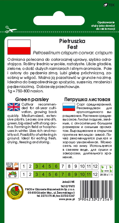 Pietruszka naciowa 'FEST' polecana do całorocznej uprawy, szybko odrastająca. Rośliny średnio wysokie, rozłożyste. Liście gładkie, zielone, o dość dużych rozmiarach i silnym aromacie. Okres wegetacji wynosi 75-90 dni (wiosną i latem) oraz 140-160 dni w uprawie jesiennej. Polecana do bezpośredniego spożycia, suszenia, mrożenia i pędzenia zimą. Wymaga gleby próchnicznej, zasobnej w wilgoć, nie zaskorupiającej się. Można ją pozostawić w gruncie na zimę. Dobrze się przechowuje.