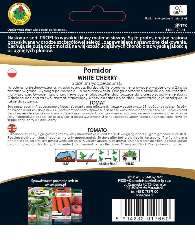 Nasiona pomidorków White Cherry to doskonały wybór dla każdego ogrodnika, który pragnie wprowadzić do swojego ogrodu odrobinę nietuzinkowego piękna. Niebanalna barwa skórki pomidorów przyciąga wzrok, tworząc niepowtarzalne kompozycje przy każdym posiłku.