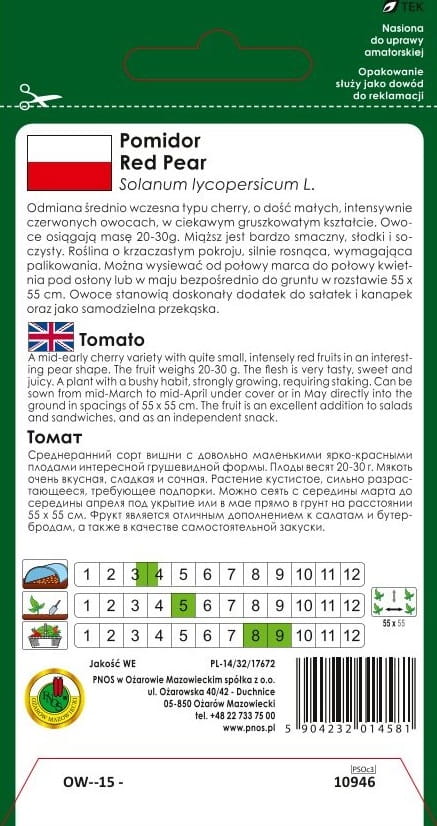 Wczesna odmiana pomidora koktajlowego, bardzo plenna. Roślina niska lub średniej wysokości, o wiotkich łodygach i lekko krzewiącym się pokroju. Owoce niewielkie, o masie 15–30 g, mają charakterystyczny gruszkowaty kształt, intensywnie czerwony kolor i gładką, błyszczącą skórkę. Nie wykazują tendencji do pękania czy deformacji. Pomidor Red Pear bardzo dobrze wiąże owoce także w mniej sprzyjających warunkach pogodowych, w tym w lata chłodne i wilgotne.