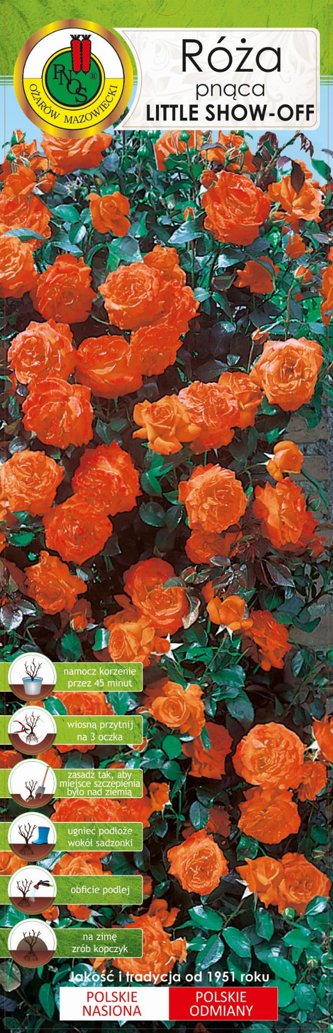 Odmiana o kwiatach barwy pomarańczowej. W zależności od składników pokarmowych w glebie kwiaty będą mniej lub mocniej intensywne w barwie. Pędy róż pnących są grube, sztywne. Liście w odmianach pnących zdobią roślinę równie bogato jak kwiaty. Wypełniają przestrzeń między pędami tworząc zwarty pokrój rośliny. Odmiany pnące wymagają podpierania. Cechuje je silny wzrost. Osiągają wysokość nawet do 4 metrów.