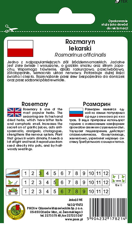 Rozmaryn to jedno z najpopularniejszych ziół śródziemnomorskich. Jadalne jest ziele świeże i wysuszone, o gorzkim smaku oraz silnym zapachu. Wspomaga trawienie, działa rozkurczowo, przeciwbólowo, żółciopędnie, wzmacnia układ nerwowy. Potrzebuje dużej ilości światła i ciepła. Rozmnażanie przez siew bezpośrednio do doniczek oraz przez sadzonki półzdrewniałe.