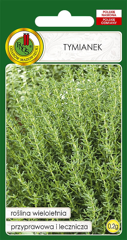 Roślina wieloletnia. Surowcem przyprawowym jest jego ziele, które zawiera olejki eteryczne. TYMIANEK charakteryzuje się aromatycznym zapachem i piekącym, gorzkim smakiem. Ma właściwości wykrztuśne, przeciwkaszlowe, bakteriostatyczne, przeciwzapalne. Pobudza czynność żołądka, uspokaja układ nerwowy. Łatwy w uprawie. Uprawa z siewu wprost do gruntu lub z rozsady.